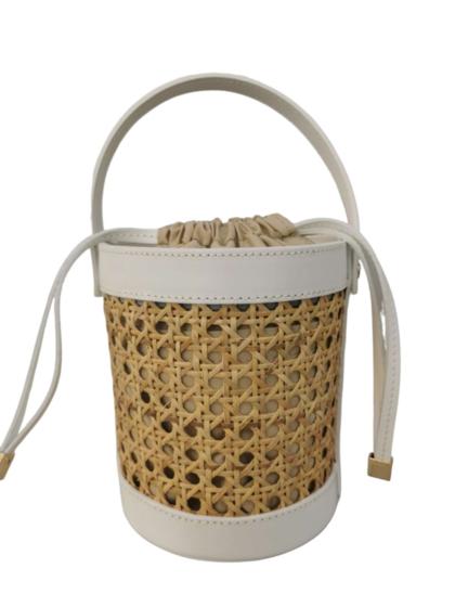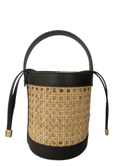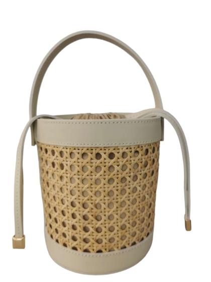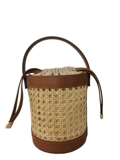 Bucket bag in genuine leather with raffia. Internal zip pocket. Internal cell phone pocket. Gold-colored metal accessories.