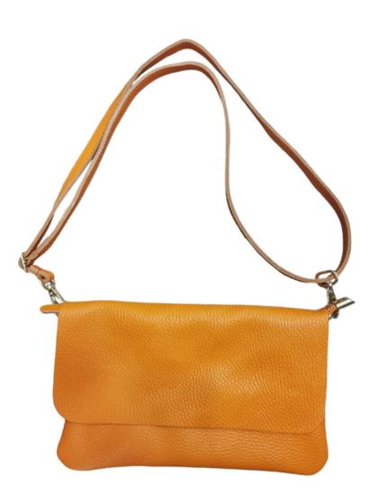 Handbags and shoulder straps in colored genuine leather. Open flap with metal. Internal zips. Pigskin interior. Adjustable leather shoulder straps. Gold accessories. Made in Italy.