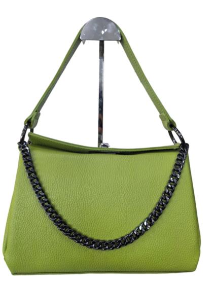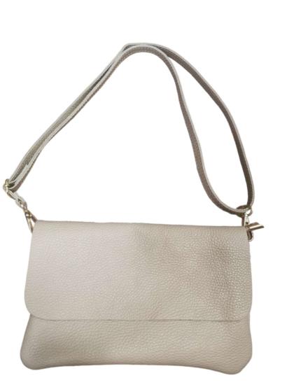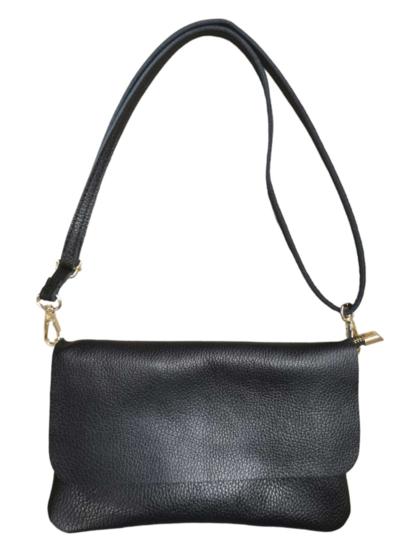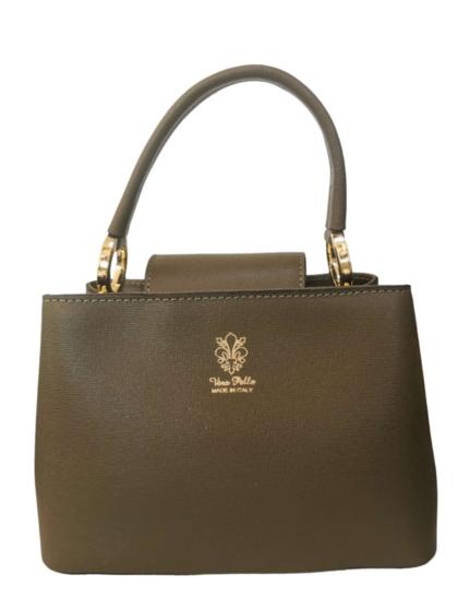 Genuine leather handbag. Closure With flap accessory, Internal zip pocket, Internal mobile phone pocket. Divider pocket with zip. Accessories in gunmetal metal, Leather shoulder straps. Made in Italy.