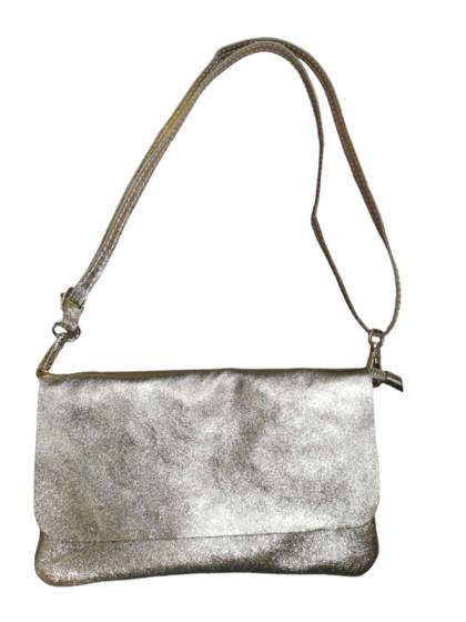 Genuine leather handle bag. Made in Italy. Back pocket with zip. Adjustable genuine leather shoulder strap. Silver-colored metal accessories.