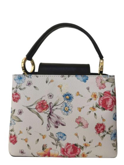 Genuine leather handbag. Open with flap. Pig leather interior. two separate compartments.Pocket with zippers.Adjustable wide genuine leather straps.Gold accessories.Made in Italy.