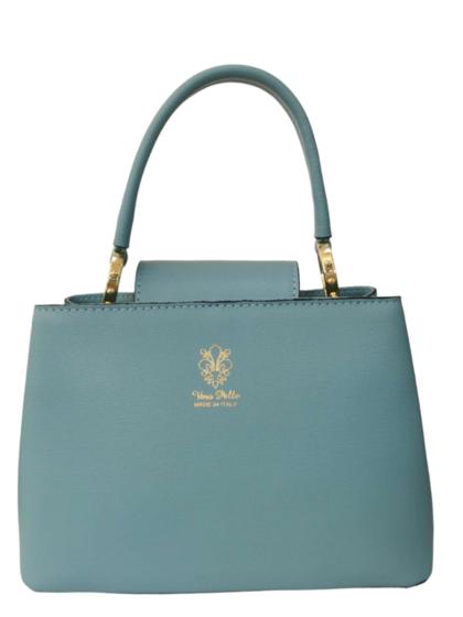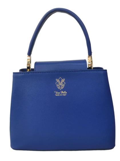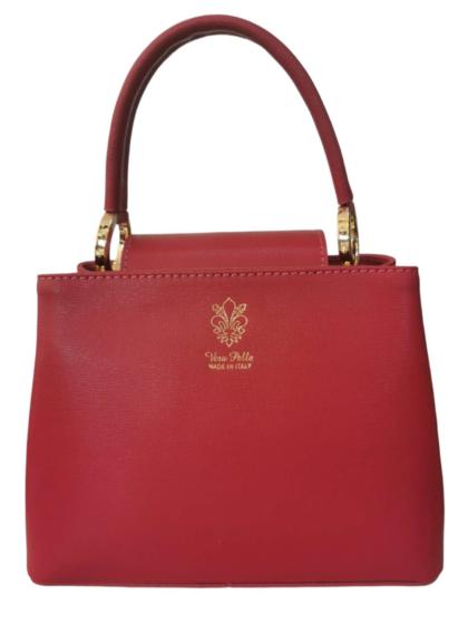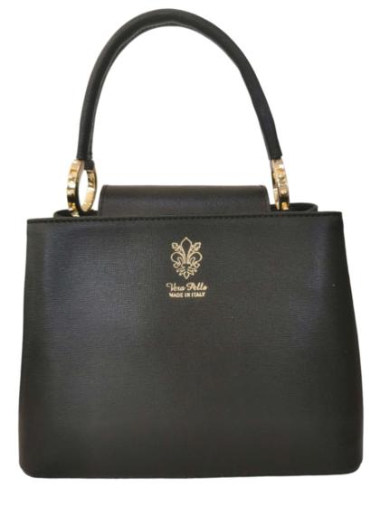 Genuine leather handle bag.Three compartments.There are magnets in the pockets on both sides.Central pocket with zippers.Adjustable straps.Gold accessories.Made in Italy.