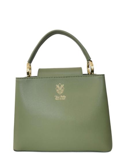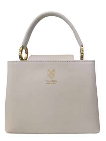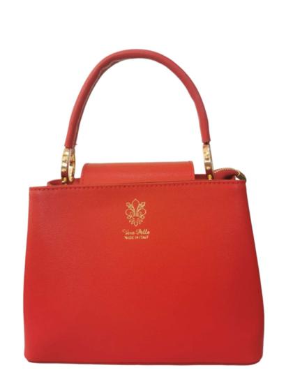 Handbag in real dollar leather. Made in Italy. Leather handle. Flap closure. Closed with zip. Internal cell phone pocket. Internal zip pocket. Gold-colored metal accessories.