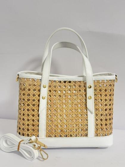 Handbag with two handles in real leather with Viena straw.Closure with caramida.Interior with fabric purse.Leather straps.Gold accessories.RUGA leather.Made in Italy.