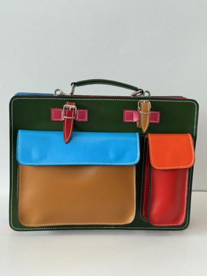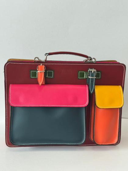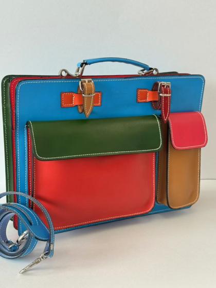 Colorful genuine leather briefcase. Two pockets. Zip closure. Genuine leather shoulder strap. Silver metal hardware. Cowhide leather. Made in Italy.