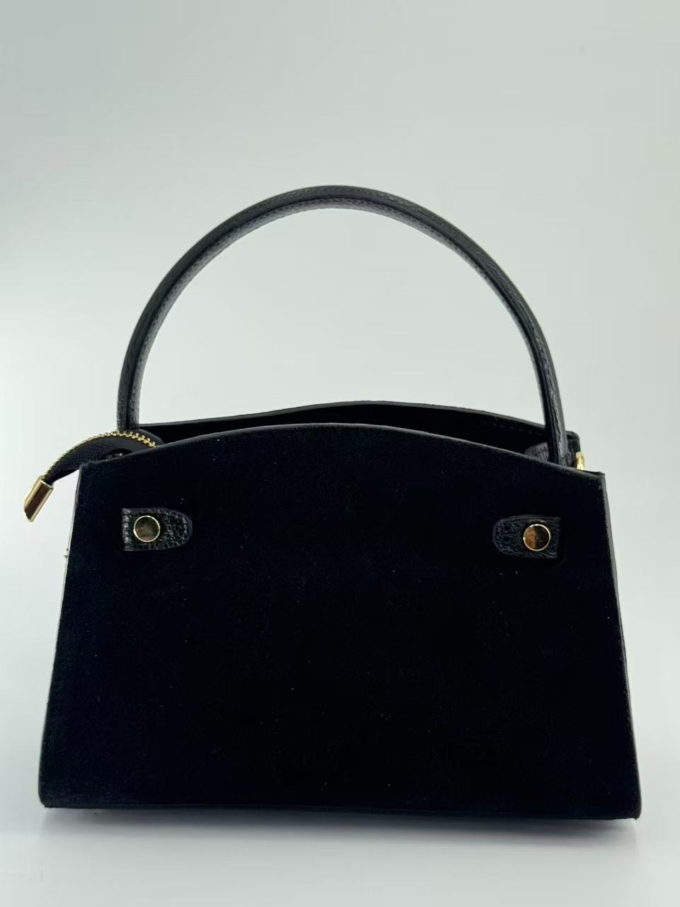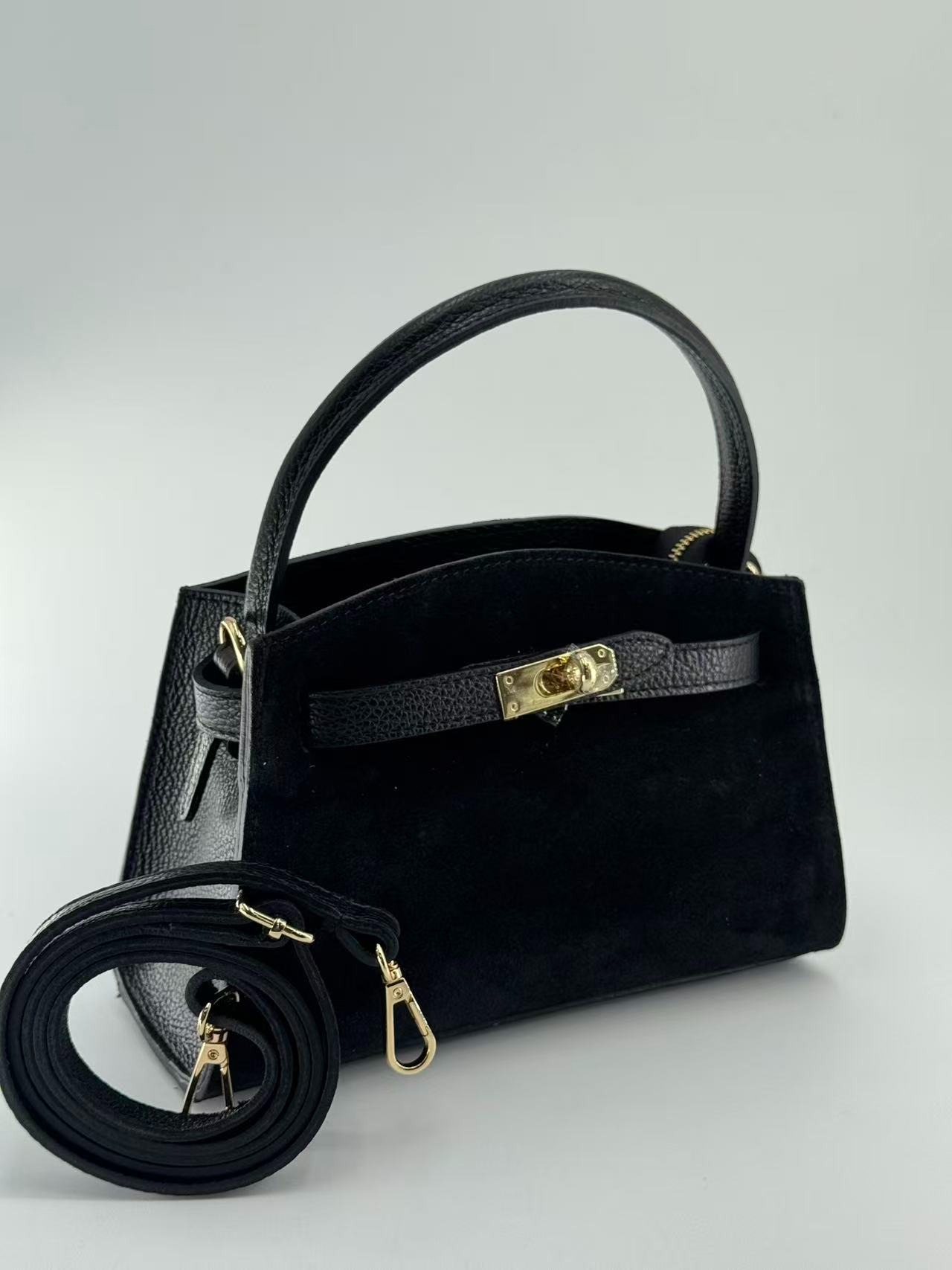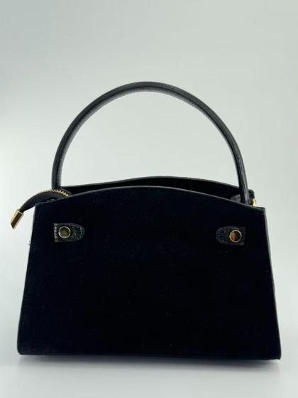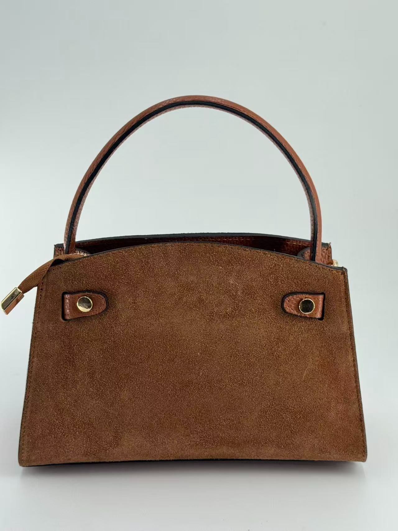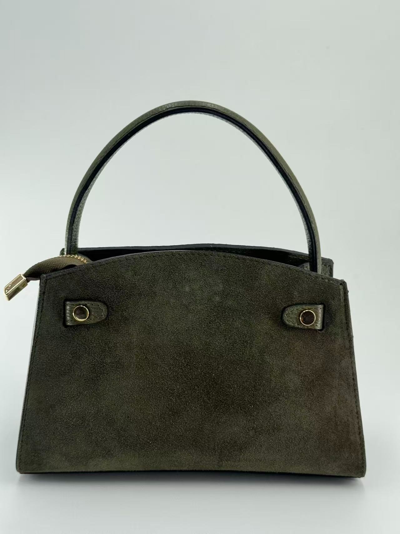 Suede bag with dollar leather handle and straps. Zipper opening. Pigskin interior. Zippered pocket. Adjustable strap. Gold accessories. Made in Italy.