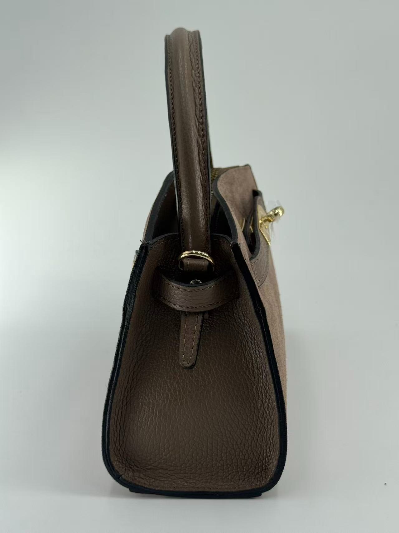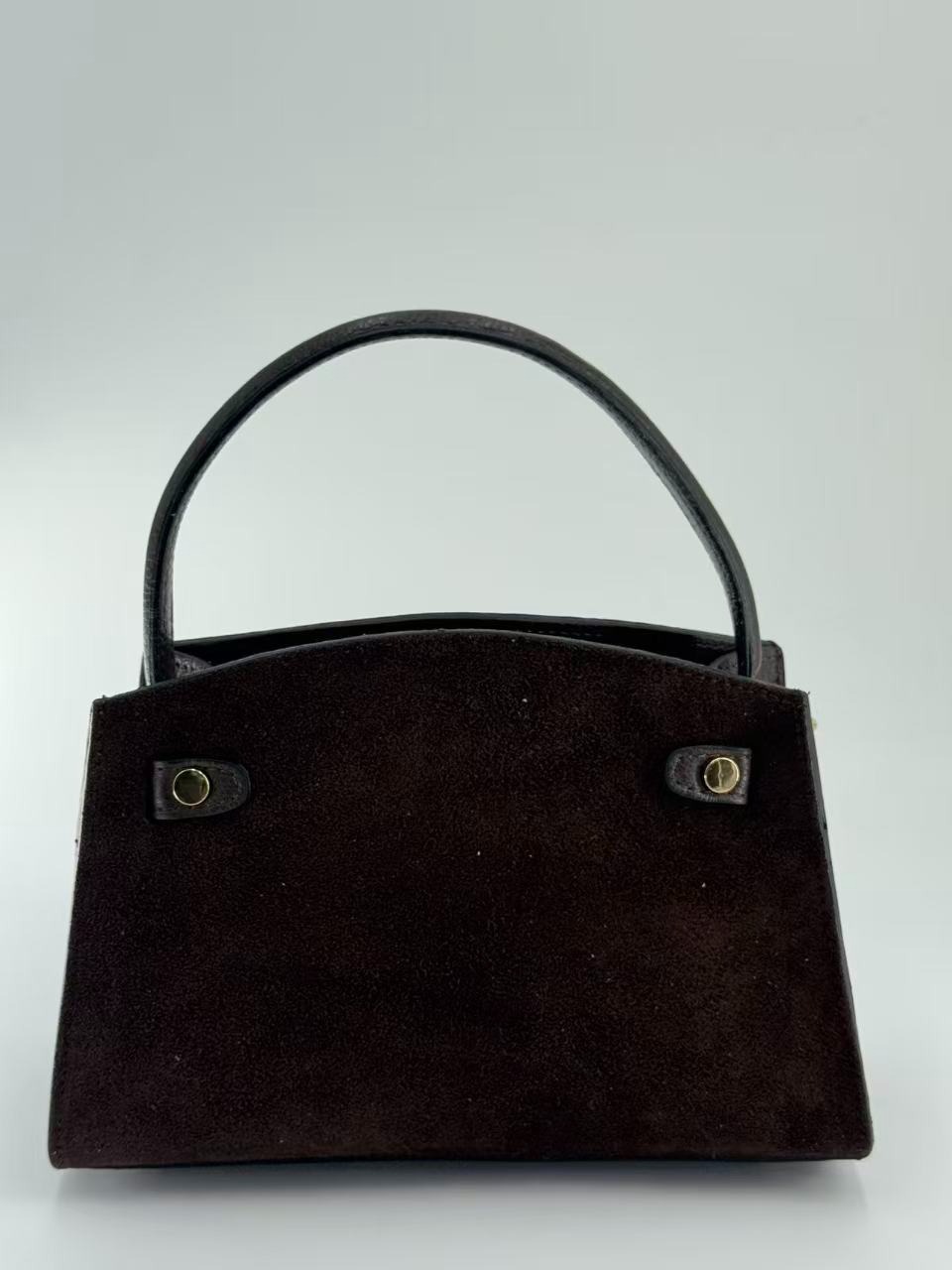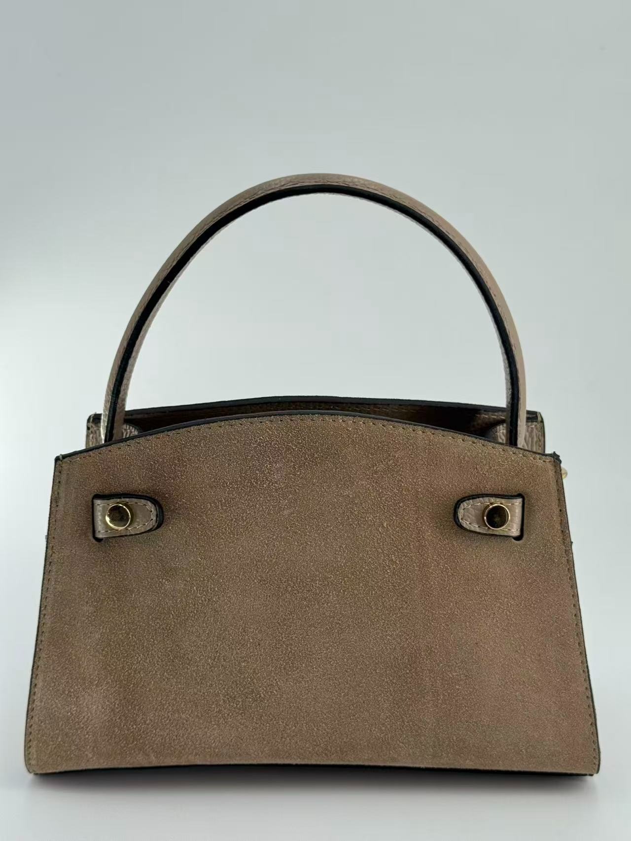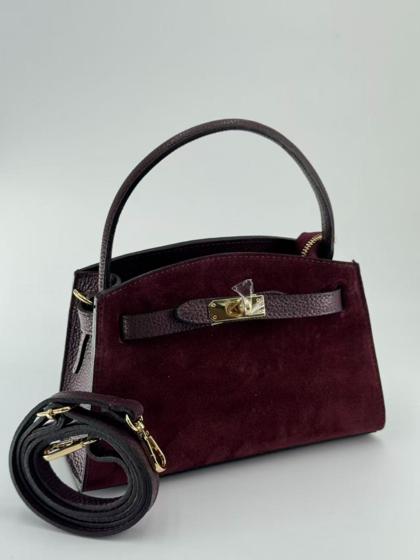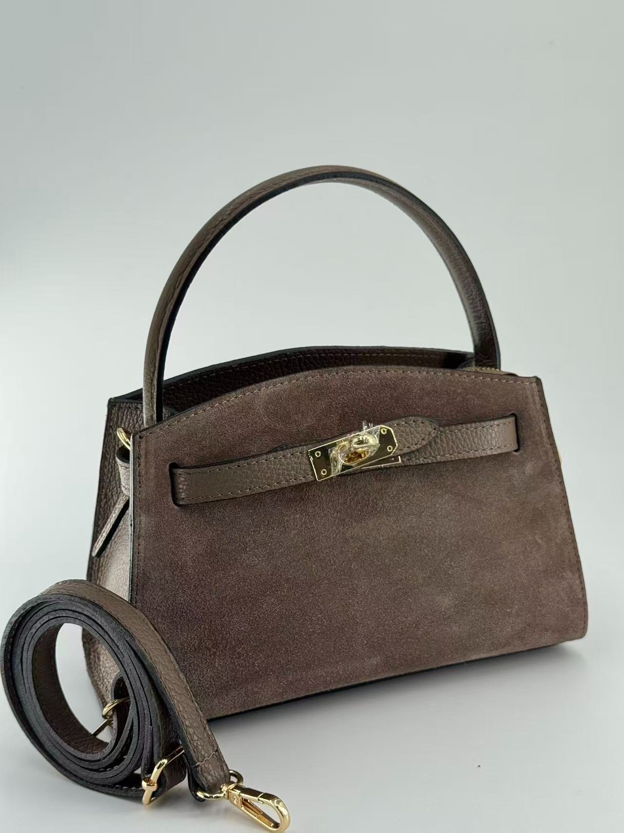 Suede bag with dollar leather handle and straps. Zipper opening. Pigskin interior. Zippered pocket. Adjustable strap. Gold accessories. Made in Italy.