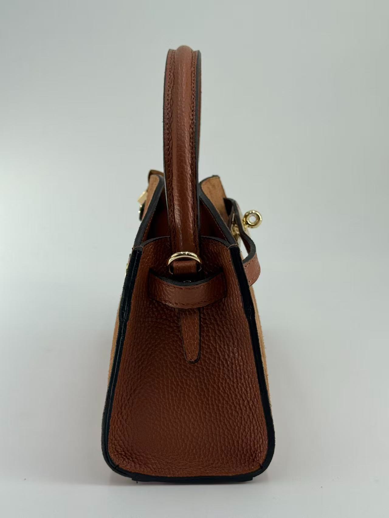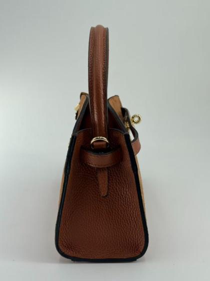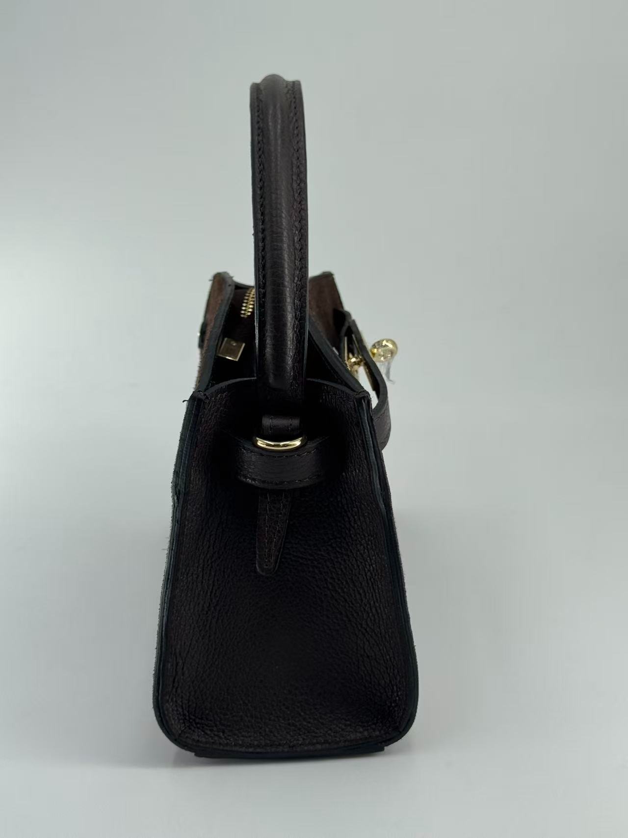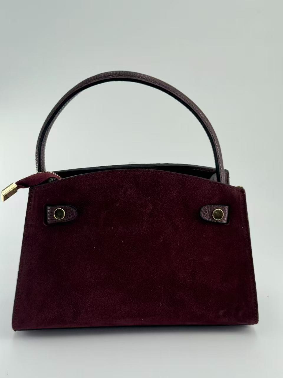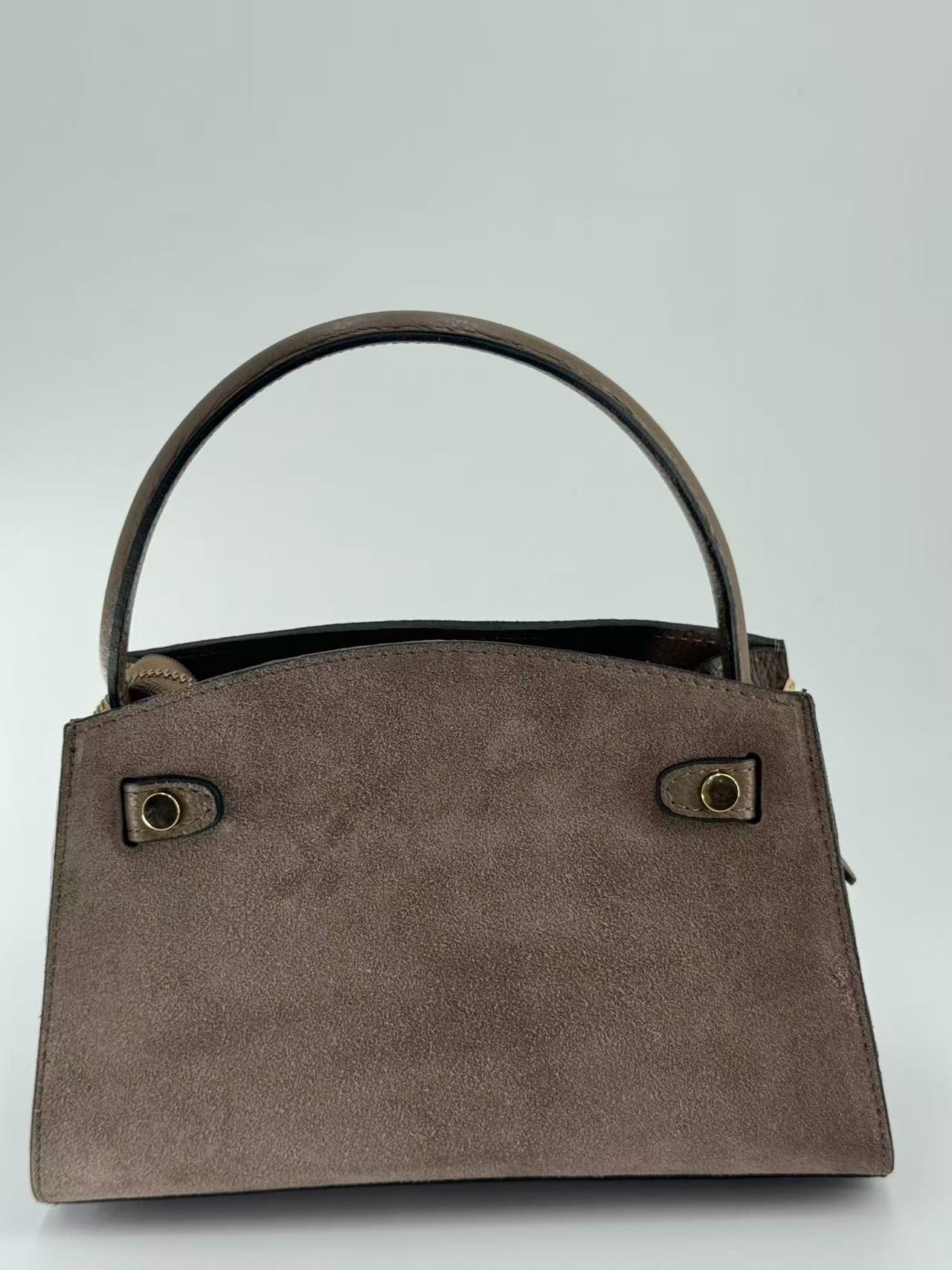 Suede bag with dollar leather handle and straps. Zipper opening. Pigskin interior. Zippered pocket. Adjustable strap. Gold accessories. Made in Italy.