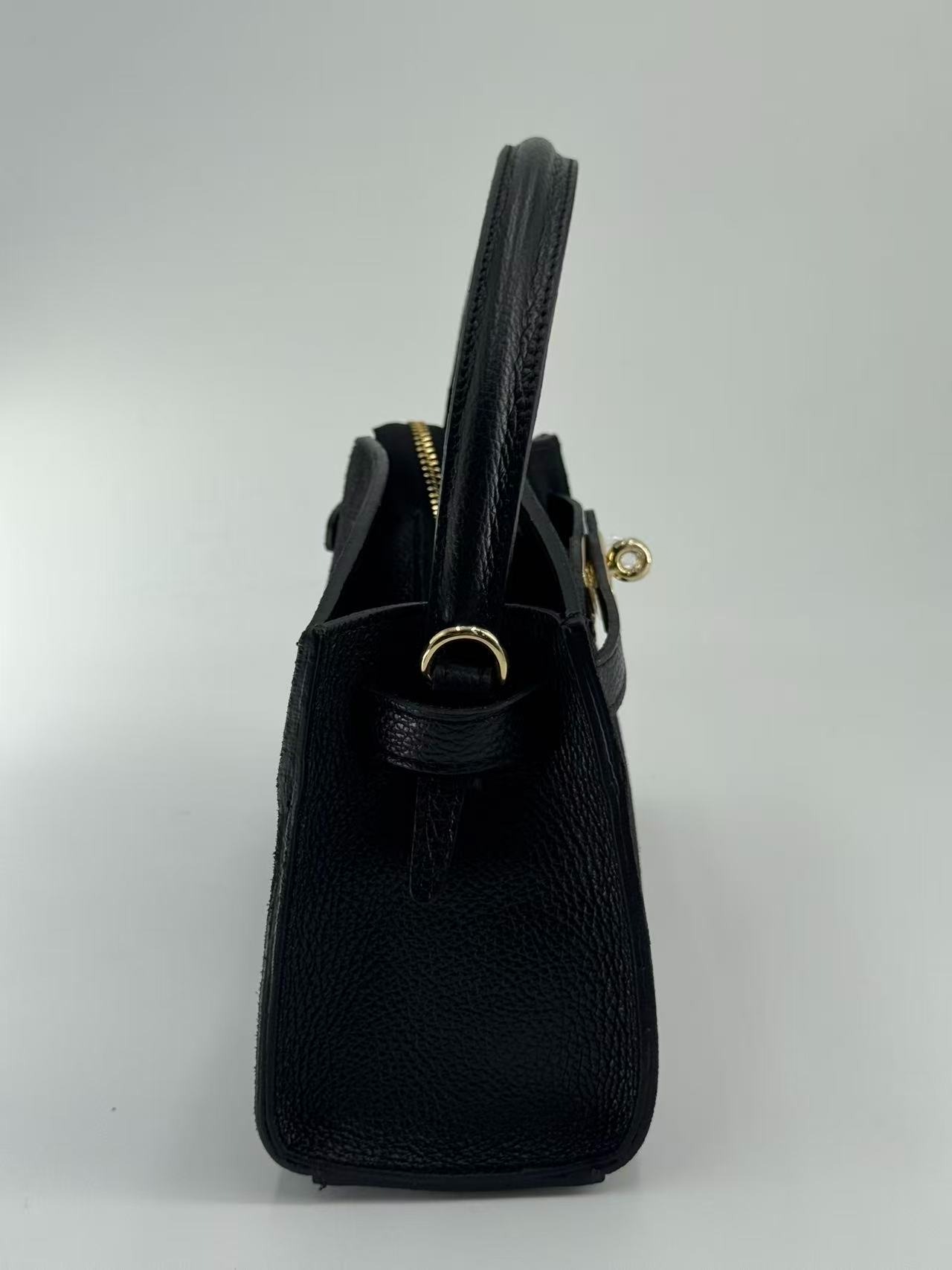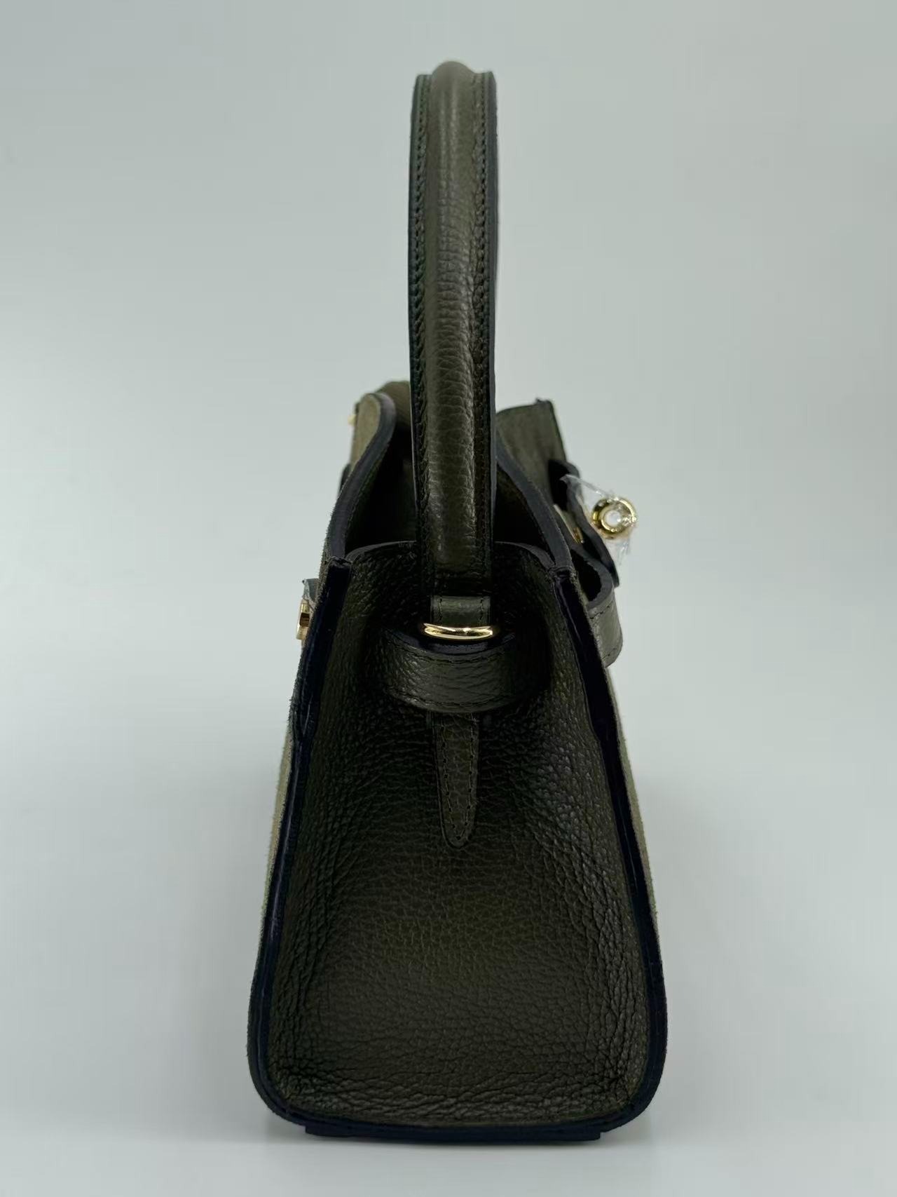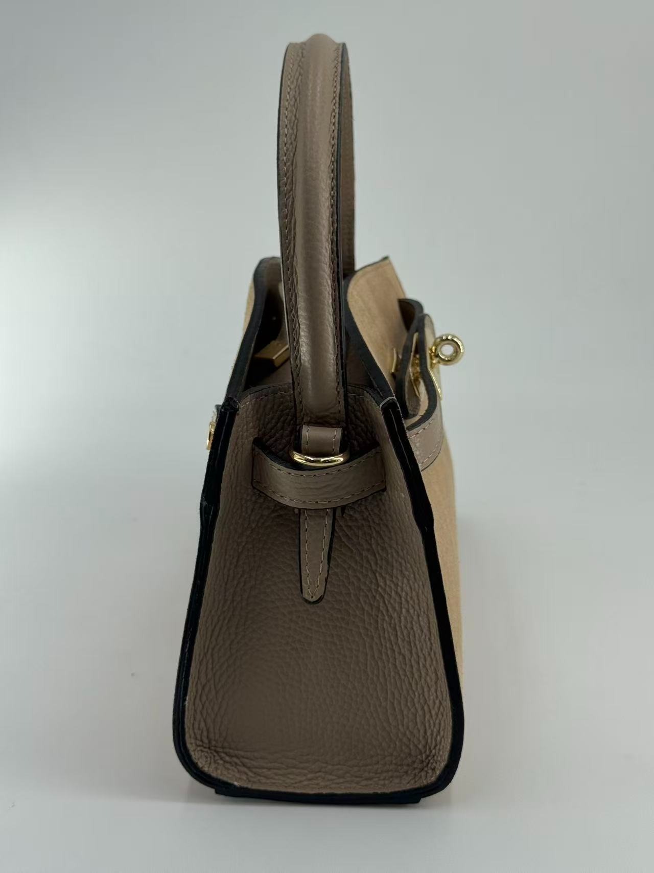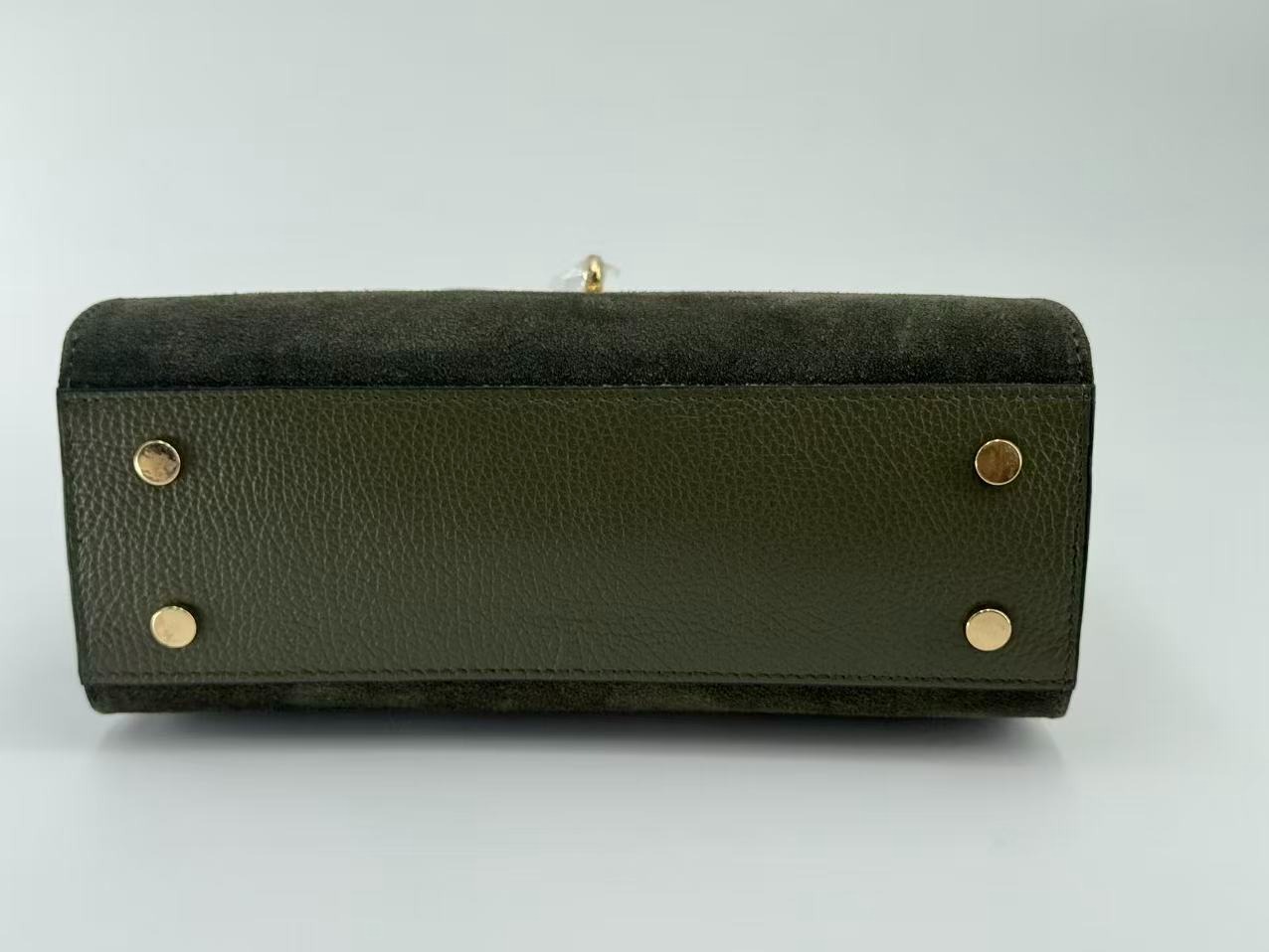 Suede bag with dollar leather handle and straps. Zipper opening. Pigskin interior. Zippered pocket. Adjustable strap. Gold accessories. Made in Italy.
