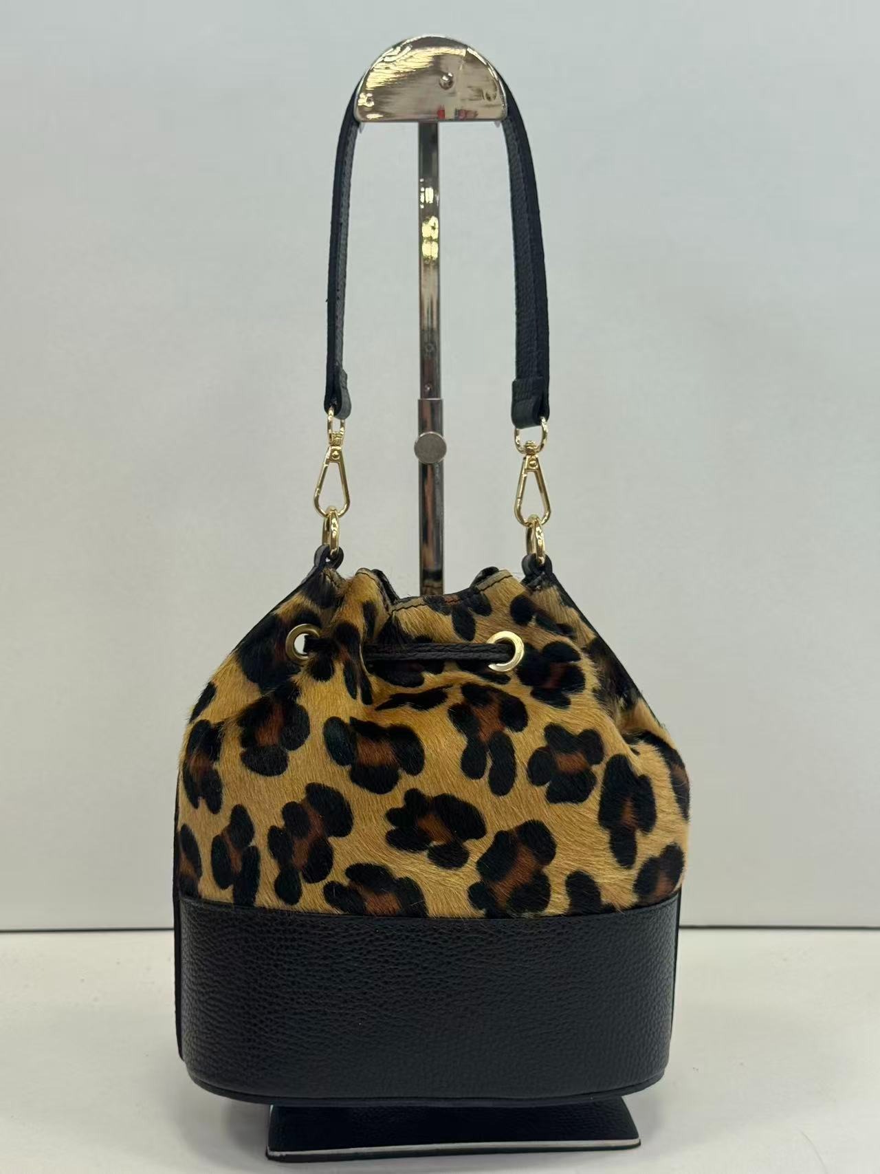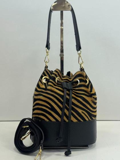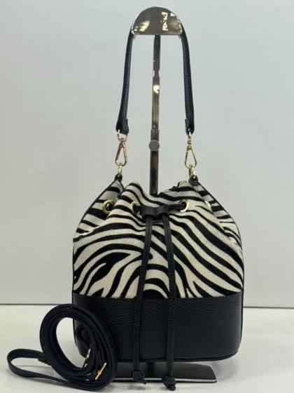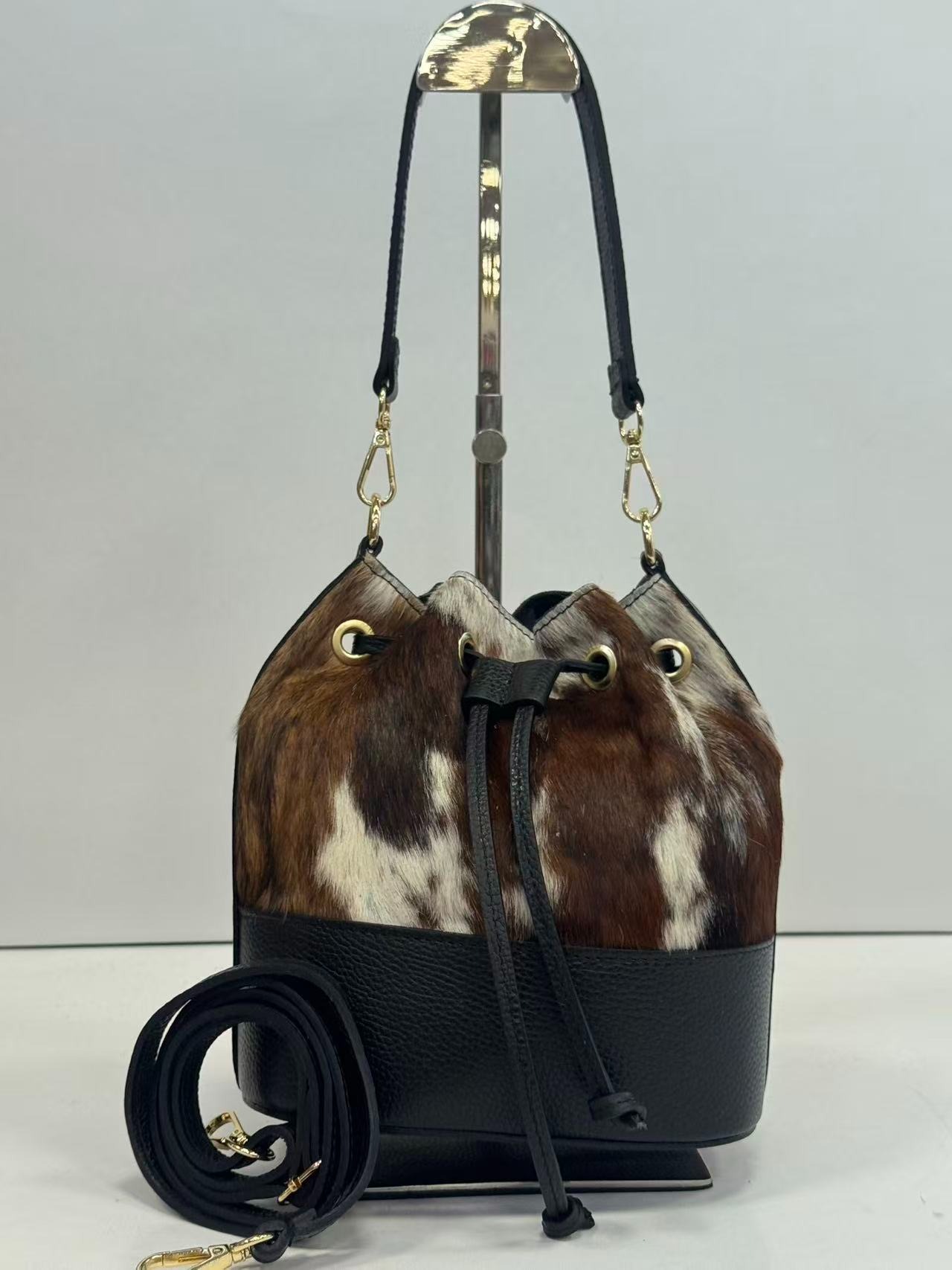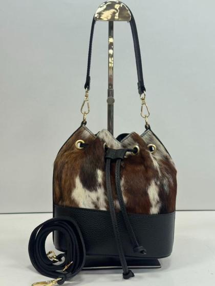 Ponyskin bag. Handle and straps in dollar leather. Lace-up closure. Lining. Zippered pocket. Adjustable dollar leather straps. Gold accessories. Made in Italy.